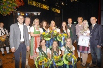 Abbildung: Von den Besuchern gewählt: - 38. Hörsteiner Herbstkönigin Katharina Hain 5. von links 1. Prinzessin Franziska Heilmann 4. von links 2. Prinzessin Jana Wonschik 6. von links Glückwünsche überbrachten 1. Bürgermeister Alexander Legler und Bundestagsabgeordnete Andrea Lindholz 3. von links
